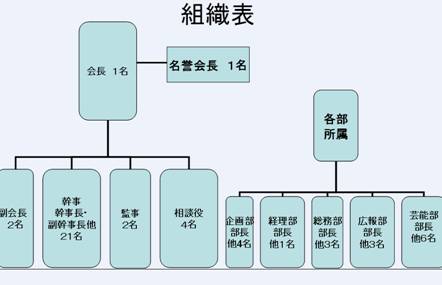 会長1名、副会長若干名、幹事長1名、副幹事長若干名、幹事20名以内、監事2名、参与若干名。