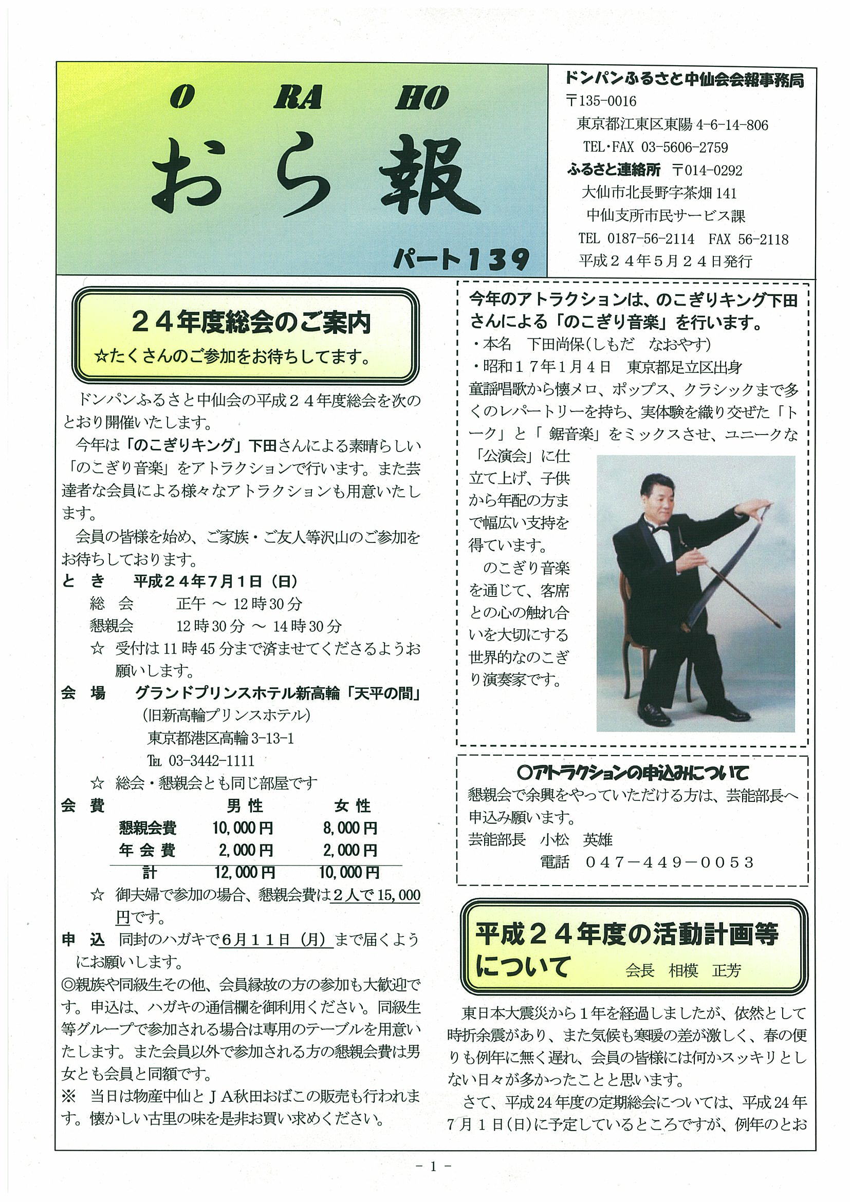 ・ 24年度7月1日(日)総会案内 アトラクションで「のこぎり音楽」等